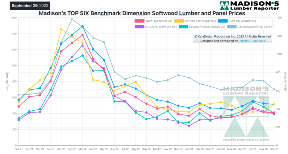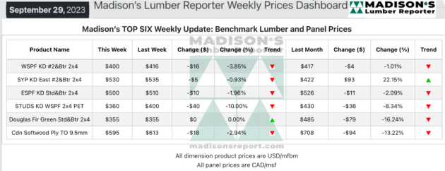 In the week ending September 29, the price of Western S-P-F 2×4 #2&Btr KD (RL) was US$400 mfbm. This is down by $16, or four per cent, from the previous week when it was $416.