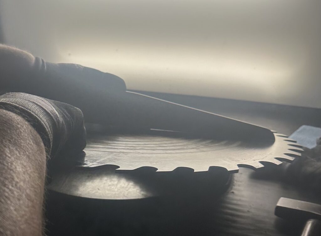 What does this look like? A correctly tensioned saw where the RPMs have the saw standing up, cutting straight, but the saw next to it isn’t, produces wedge-shaped boards. Another scenario: the saw that has too much tension and is right on the verge of being correct, but RPMs are just not enough to keep the saw standing straight, resulting in the saw going from one side of the guide to the other, all the while making thick and thin lumber.