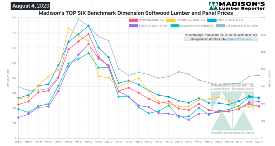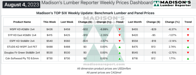 In the week ending August 4, the price of Western S-P-F 2×4 #2&Btr KD (RL) was US$426 mfbm. This is down by $29, or seven per cent, from the previous week when it was $458.