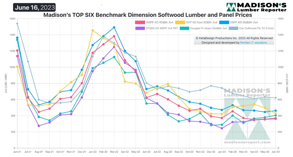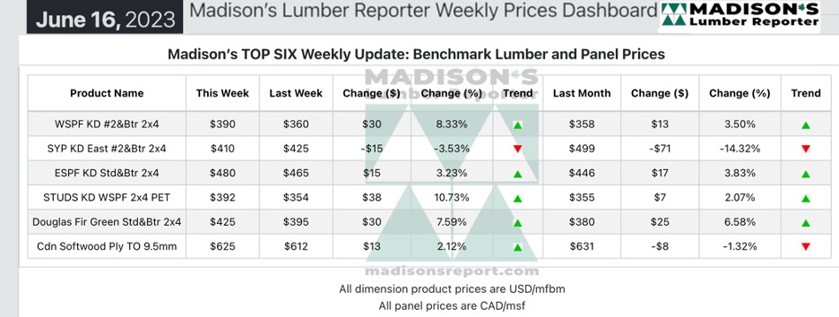 In the week ending June 16, 2023, the price of Western S-P-F 2×4 #2&Btr KD (RL) was US$390 mfbm, said forest products industry price guide newsletter Madison’s Lumber Reporter. This is up by +$30, or +8%, from the previous week when it was $360.