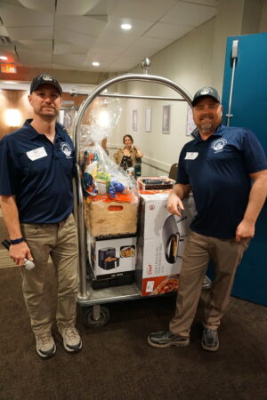 (L-R): Sean Wright and Scott Courtney giving away donated door prizes. Photo: Annex Business Media.