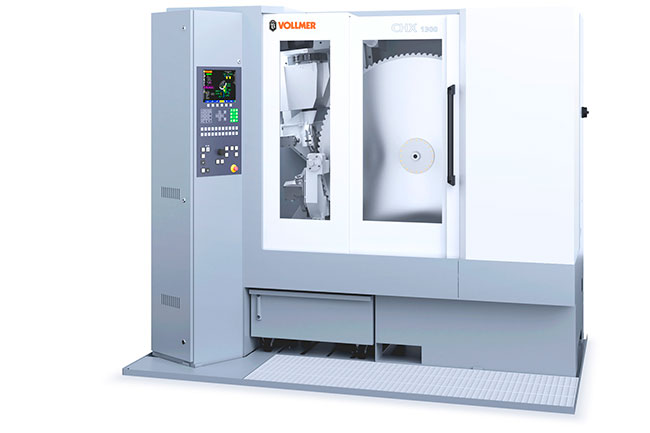 The Vollmer CHX 1300, a new grinding machine for carbide-tipped circular saw blades with a diameter up to 51 inches, machines tooth faces and tops in a single clamping process to reduce set-up time thanks to a double grinding wheel. With five CNC-controlled axes, the CHX 1300 can machine saw blades with all common tooth geometries. The HS automation solution ensures automatic loading of the CHX for unmanned operation of up to seven hours. This machine is ideal for sawmill operators, sharpening specialists and furniture makers.