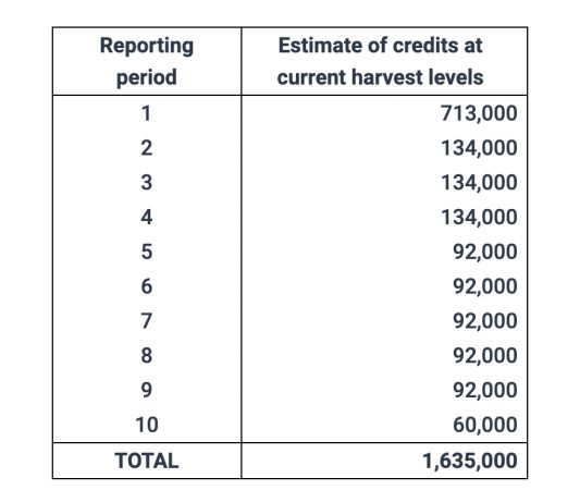 The initial model for the project has been completed and estimates of carbon credit volumes for reporting periods (years) 1-10 are as provided below: