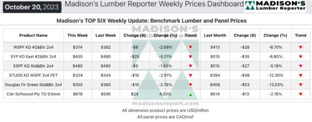 In the week ending October 20, the price of Western S-P-F 2×4 #2&Btr KD (RL) was US$374 mfbm. This is down by -$8, or -2%, from the previous week when it was $382.