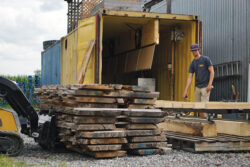 They also built a small kiln on their property in 2019 using a Wood-Mizer KD250 dehumidification wood kiln, a shipping container, and a rail conveying system for unloading and loading the wood.