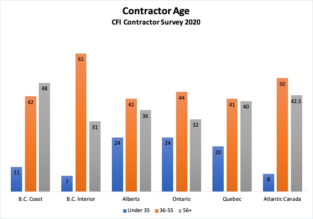 The results of CFI’s 2020 Contractor Survey show that the average age in the logging industry is continuing to increase, from 49 years old in 2018 to 52 years old in 2020. This is a cause for concern for the industry as more loggers reach retirement age, and fewer young people are available to replace them.