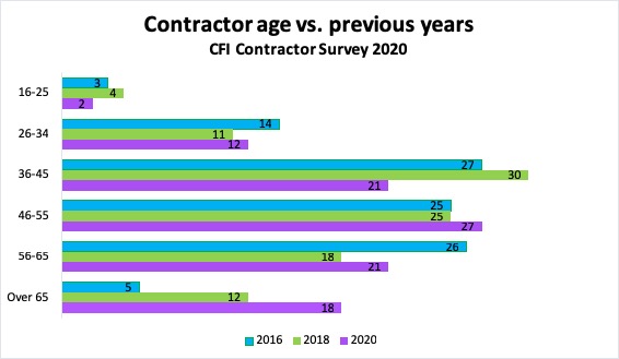 Representation in the oldest age bracket (over 65 years old) has continued to increase from 2016, when it was just five per cent, to 12 per cent in 2018 and now up to 18 per cent in 2020. The percentage of contractors 45 and under has dropped from 45 per cent in 2018 to just 35 per cent this year.